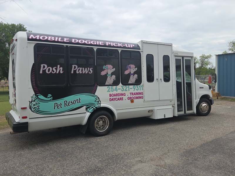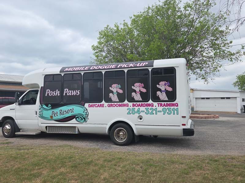 Posh Paws Pet Salon offers Bus Service that brings boarding, daycare, and vet transport directly to your door in Temple, Texas. You schedule the pickup time, and a dedicated transport arrives at your home to collect your dog or cat, whether they're heading to daycare for the afternoon, checking in for a weekend boarding stay, or riding along with you to a veterinary appointment. The service runs Monday through Saturday from six in the morning until six in the evening, which means you can coordinate pickup around your work commute or errand schedule without backtracking across town.